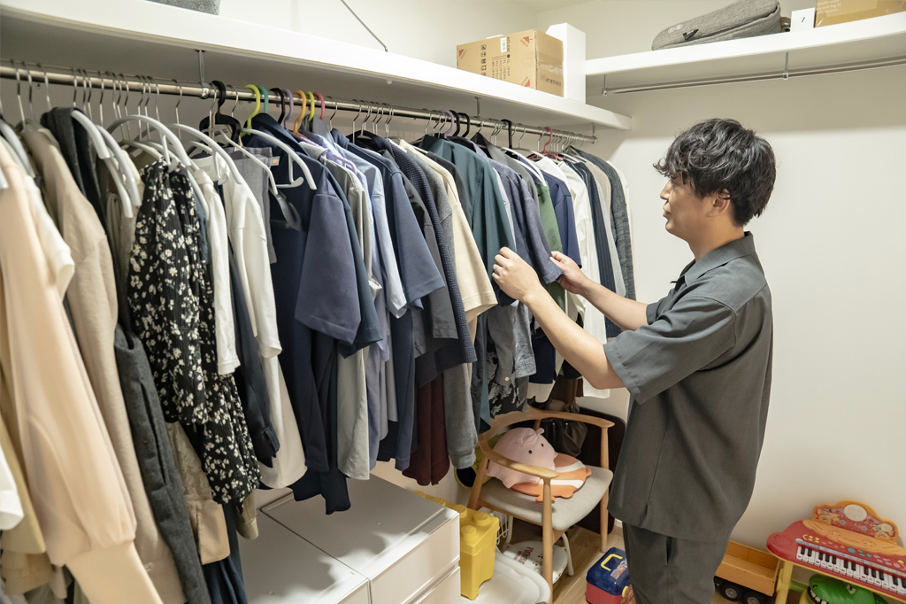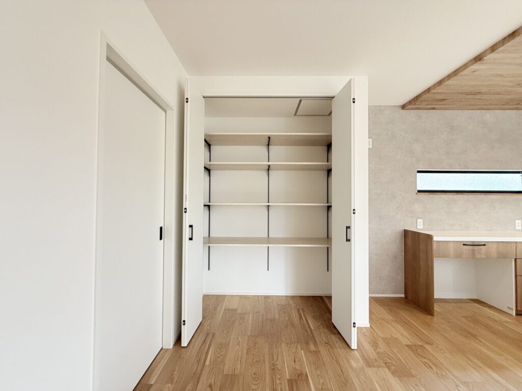 リビング横のファミリークローゼットは、パントリーとともに活躍中で、将来的には書斎にもできそうな広さです!