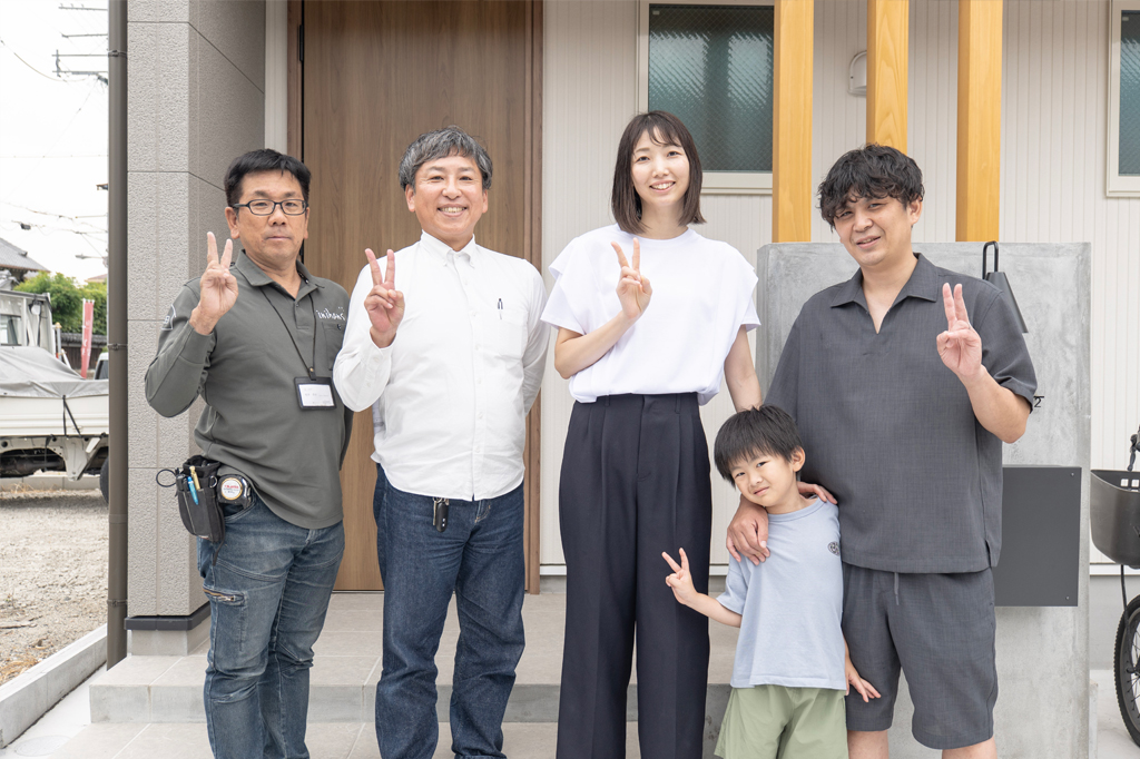 左から:現場監督/坂本、営業担当/瀧野、お施主様ご家族