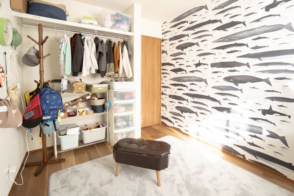 上の子の部屋は、壁一面にクジラが泳ぐ大胆なアクセントクロスを採用しました。