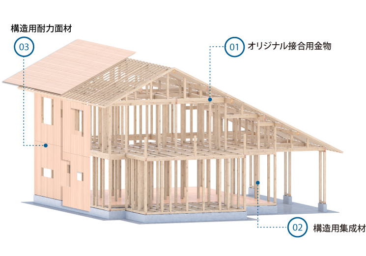 高性能金物による接合、立体解析と許容応力度計算による専用CADと、それに基づく木材プレカット加工など、高い構造信頼性を実現する、オリジナル工法「パワービルド」。柱や梁には頑丈な構造用集成材を使用し、さらに壁には構造用耐力面材で補完。点と面、両方で建物を支える、優れた性能を発揮する新しい建築工法を確立しています。