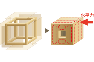 耐力面材で、土台・柱・梁・床を一体化し、ひとつの箱状とすることで、