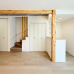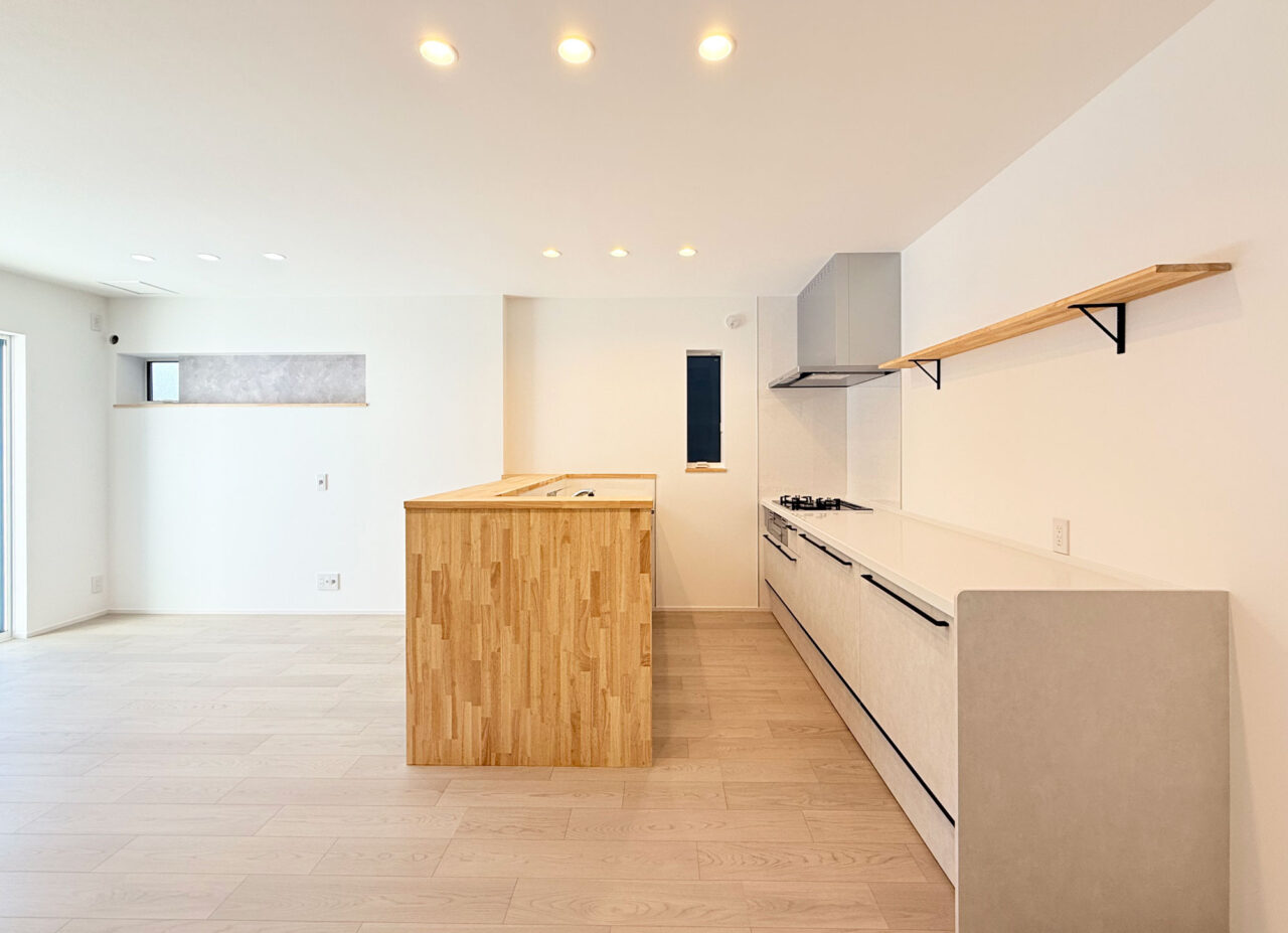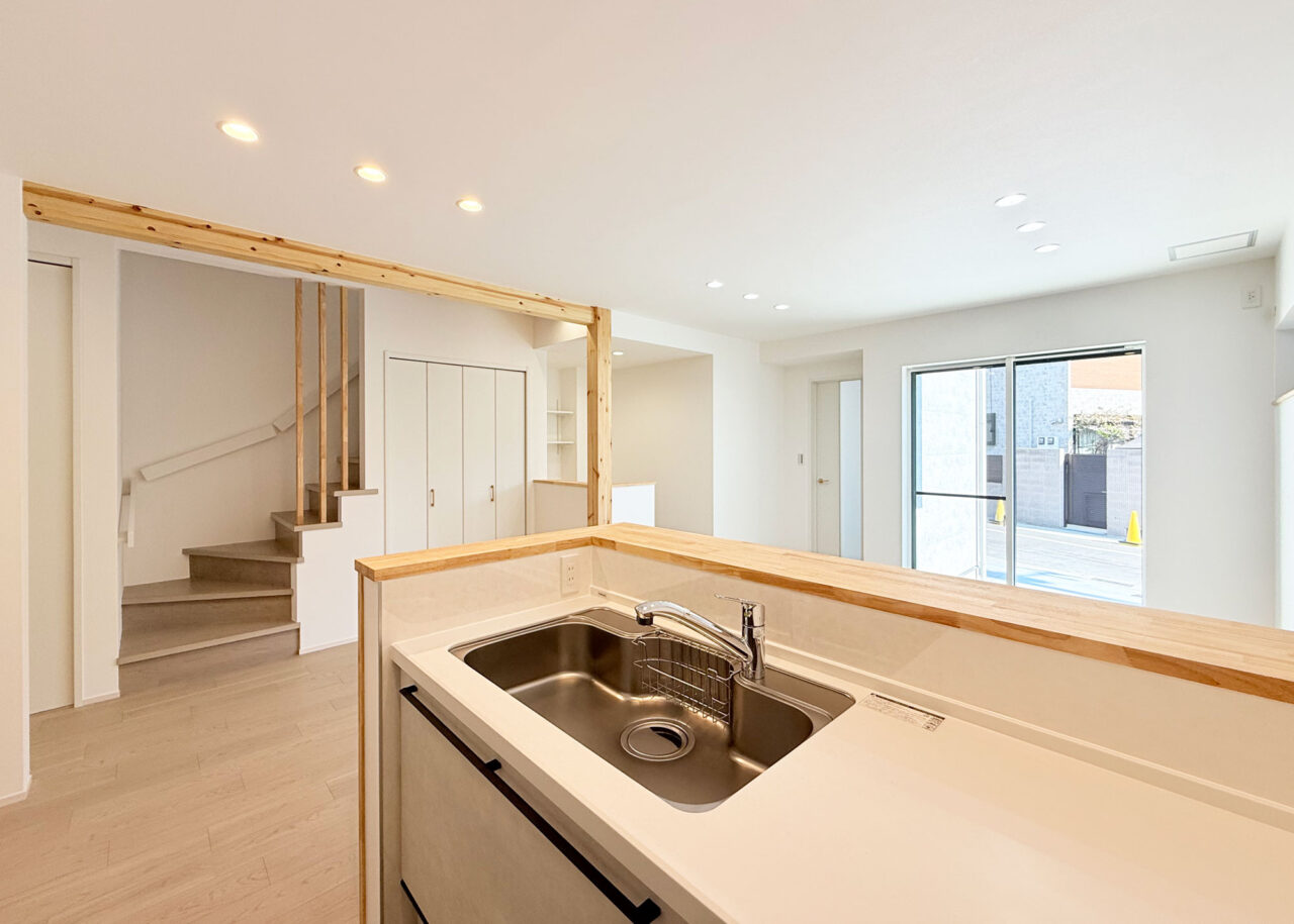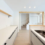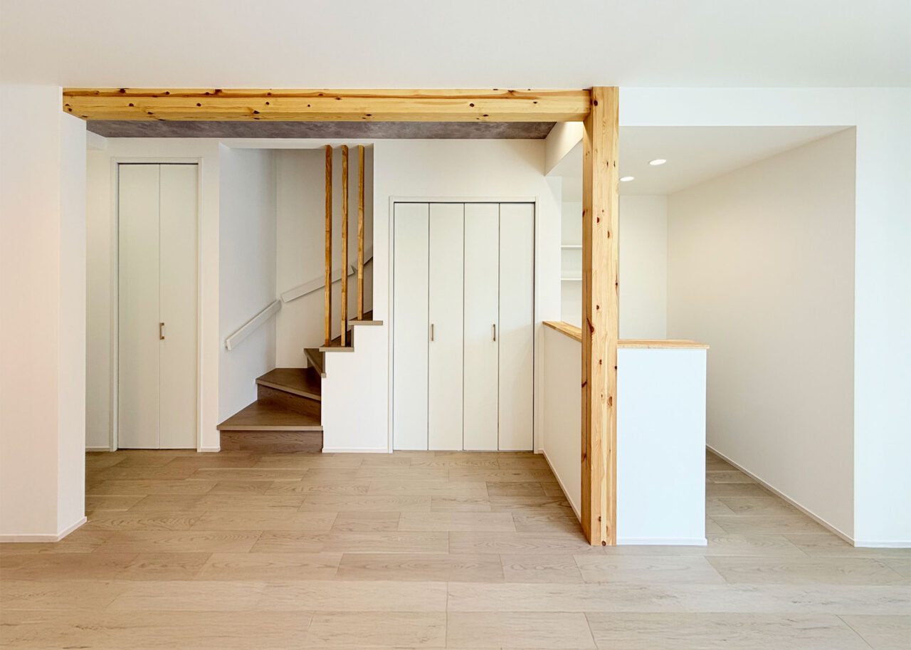 ・キッチン背面や階段まわりに施した造作工事が、空間に立体感と陰影を添える。