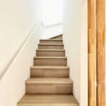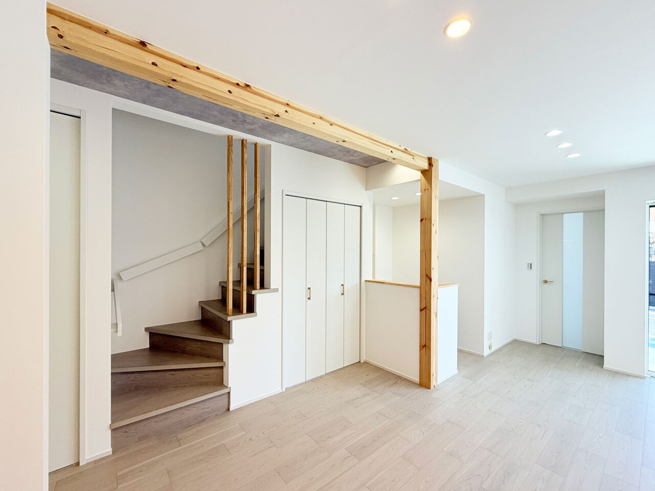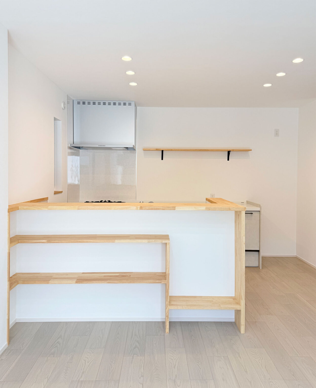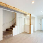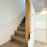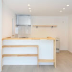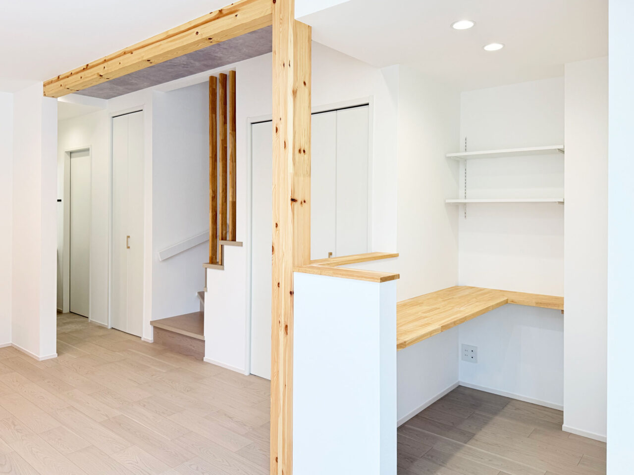 ・キッチン背面や階段まわりに施した造作工事が、空間に立体感と陰影を添える。