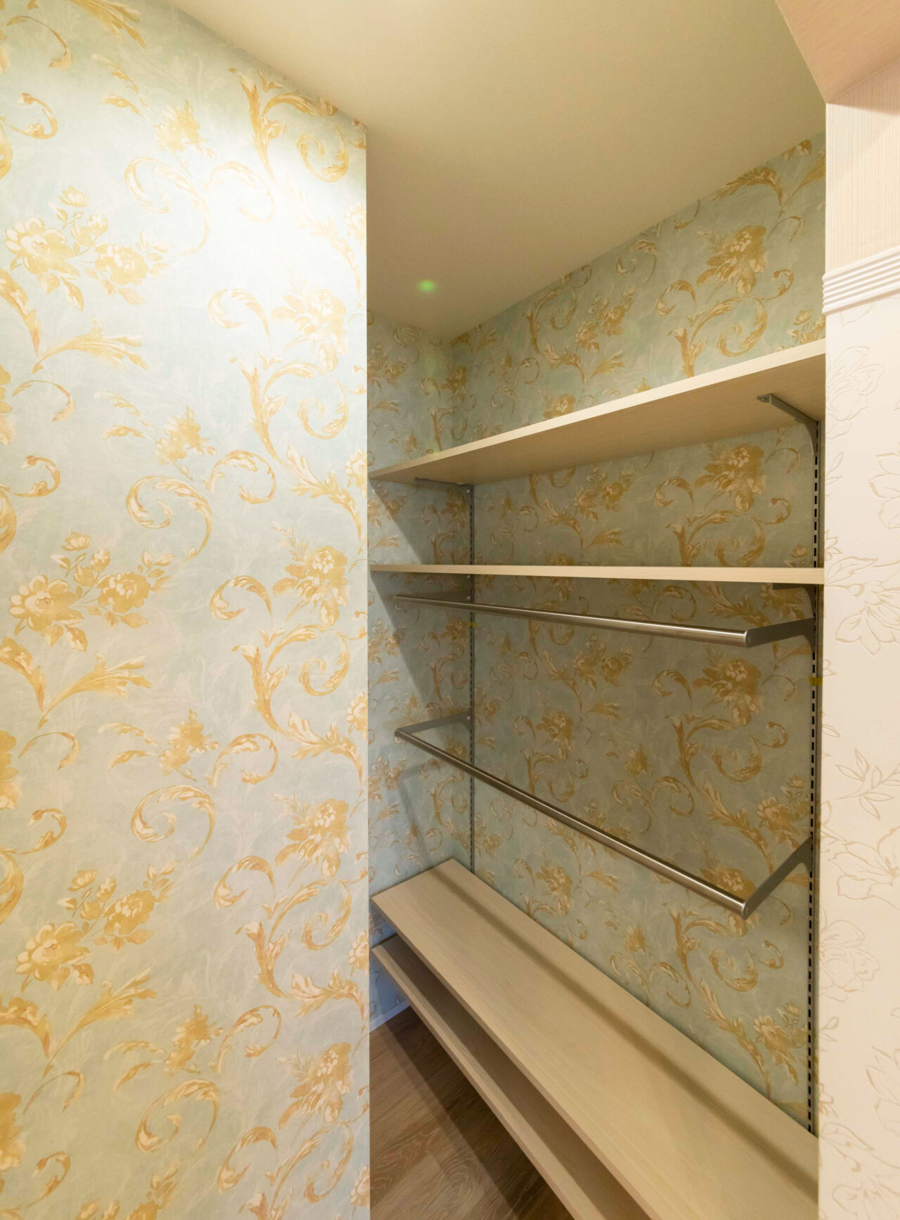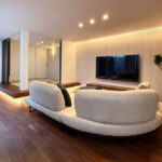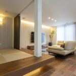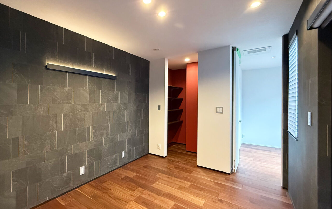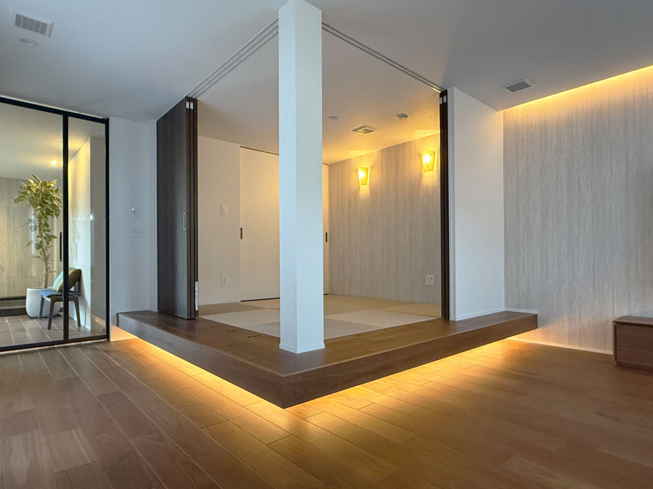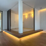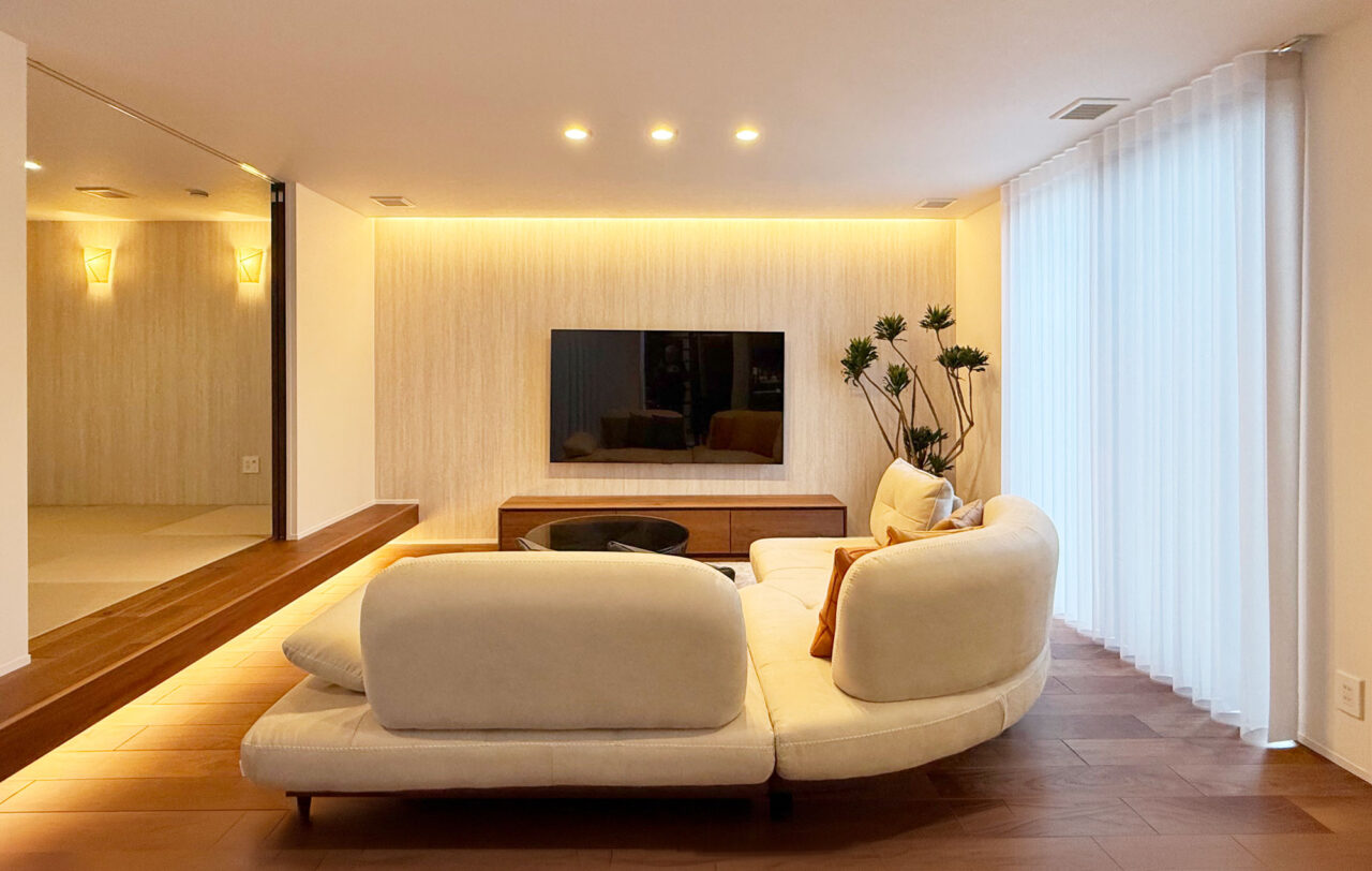 リビングに隣接する和室はアクセントクロスでつながりを持たせ、一体感を演出。壁面を柔らかく照らす間接照明が奥行きと温もりを添え、光の広がりにこだわった心地よいリラックス空間に。和室は照明と造作の工夫で浮遊感のあるフロートデザインを実現し、伝統的な和の美と現代的なスタイルが調和。日常に和の静けさと洗練を感じられる、豊かな居心地の空間が広がる。