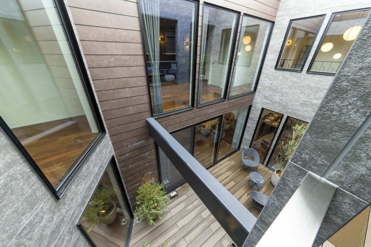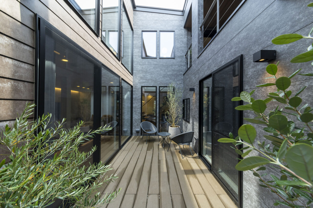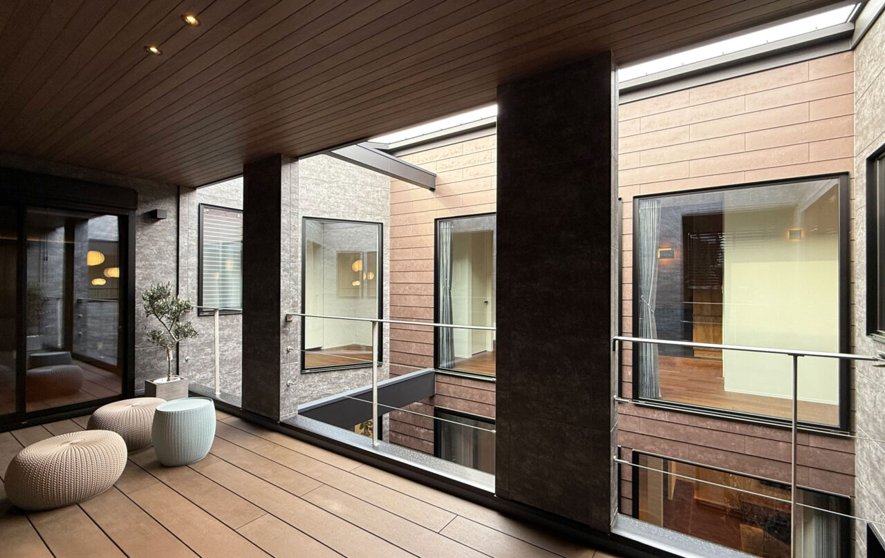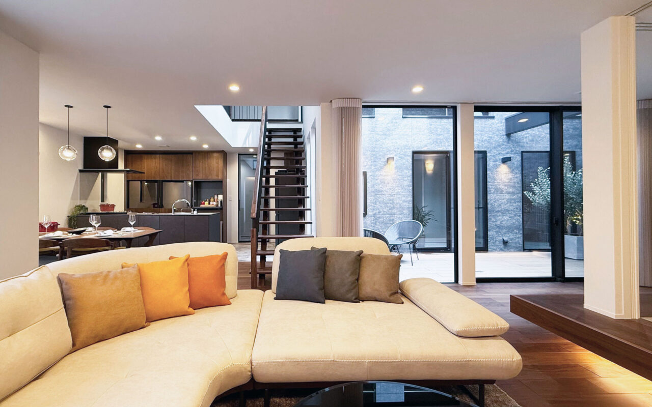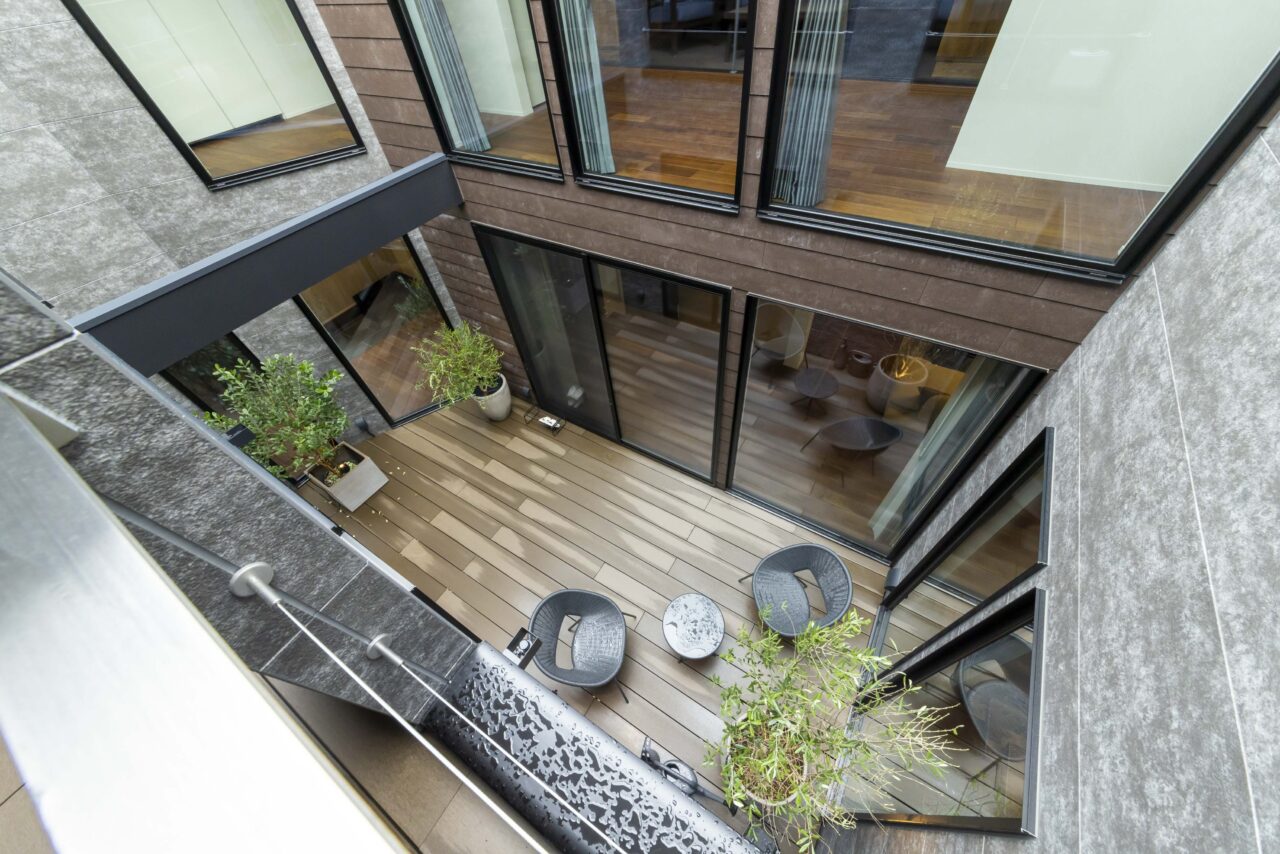 あえて窓を設けないシンプルなデザインを採用。落ち着いた佇まいの中に、ノスタルジックな気配と凛とした品格を感じさせる。室内に入ると印象は一変し、中庭から降り注ぐ自然光が広がる明るく開放的な空間へ導く。外部の喧騒を遮断したプライベートな中庭と、やわらかな光に包まれた静かな住環境が、心地よい暮らしを演出。
