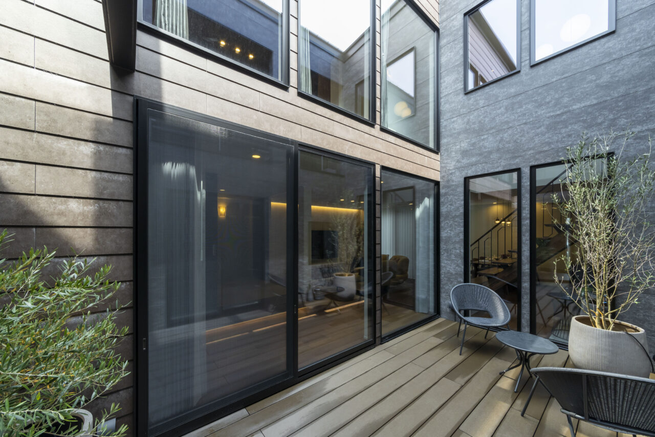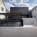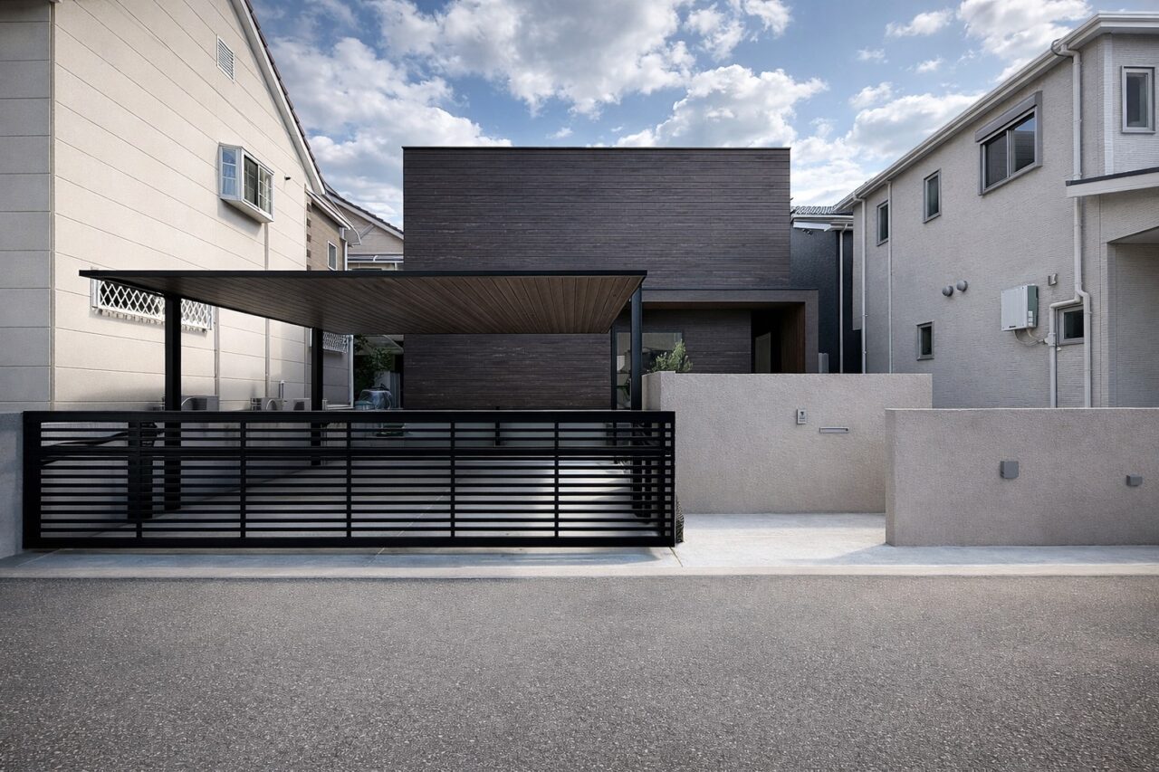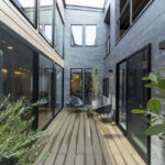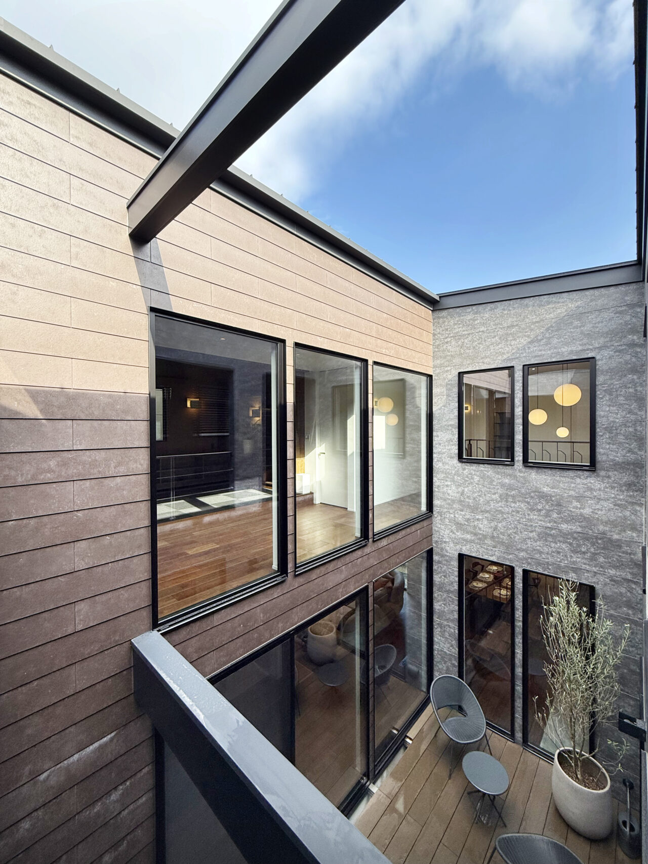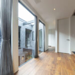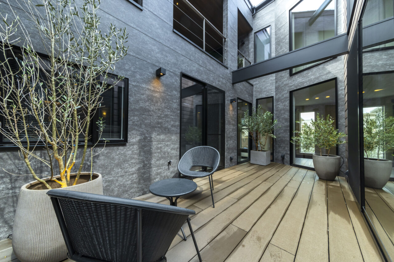 あえて窓を設けないシンプルなデザインを採用。落ち着いた佇まいの中に、ノスタルジックな気配と凛とした品格を感じさせる。室内に入ると印象は一変し、中庭から降り注ぐ自然光が広がる明るく開放的な空間へ導く。外部の喧騒を遮断したプライベートな中庭と、やわらかな光に包まれた静かな住環境が、心地よい暮らしを演出。