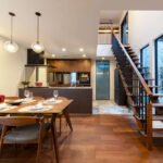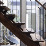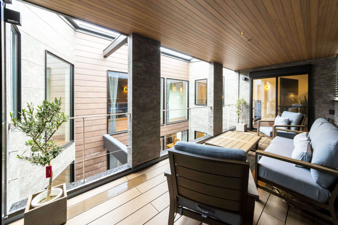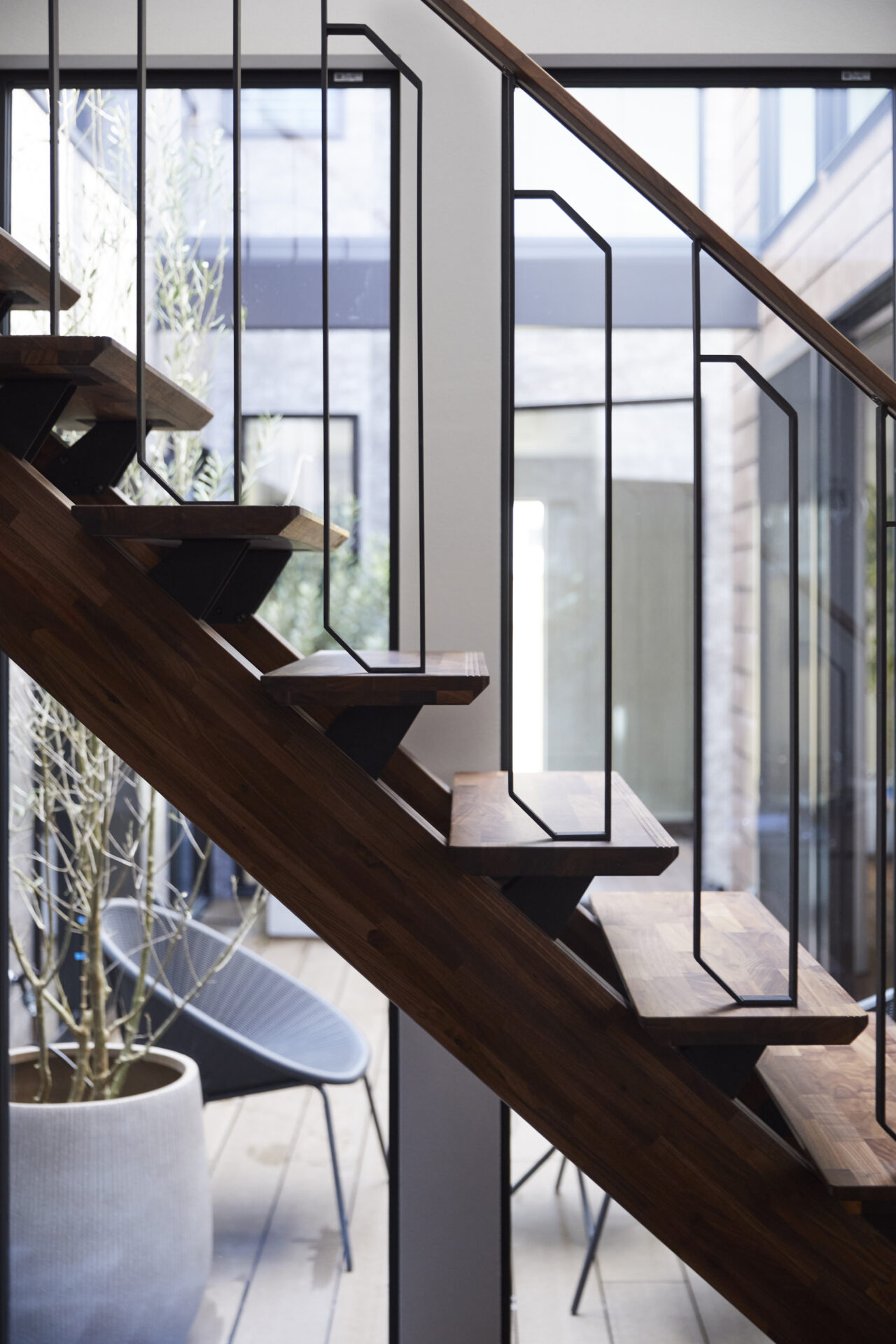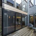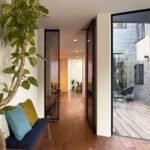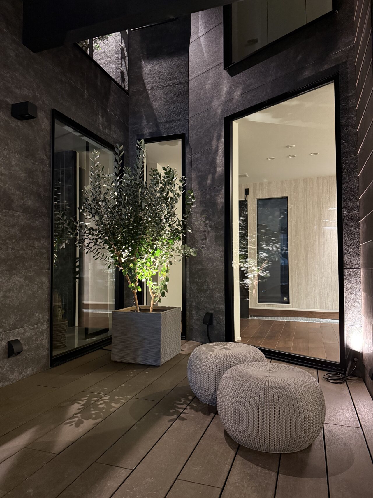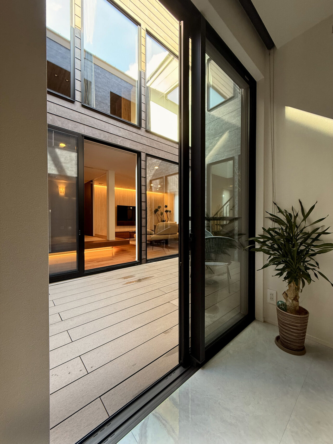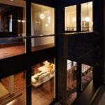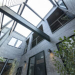 あえて窓を設けないシンプルなデザインを採用。落ち着いた佇まいの中に、ノスタルジックな気配と凛とした品格を感じさせる。室内に入ると印象は一変し、中庭から降り注ぐ自然光が広がる明るく開放的な空間へ導く。外部の喧騒を遮断したプライベートな中庭と、やわらかな光に包まれた静かな住環境が、心地よい暮らしを演出。