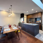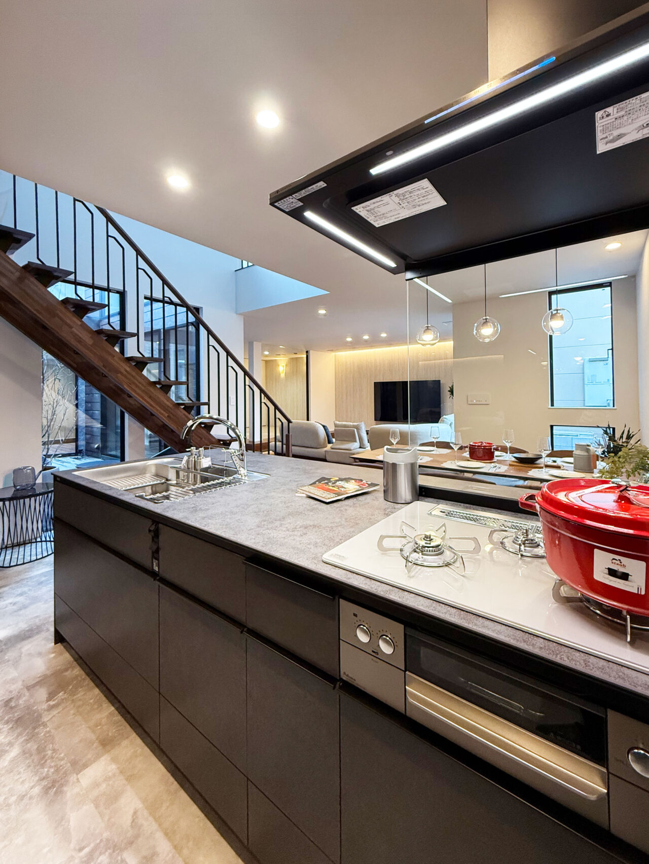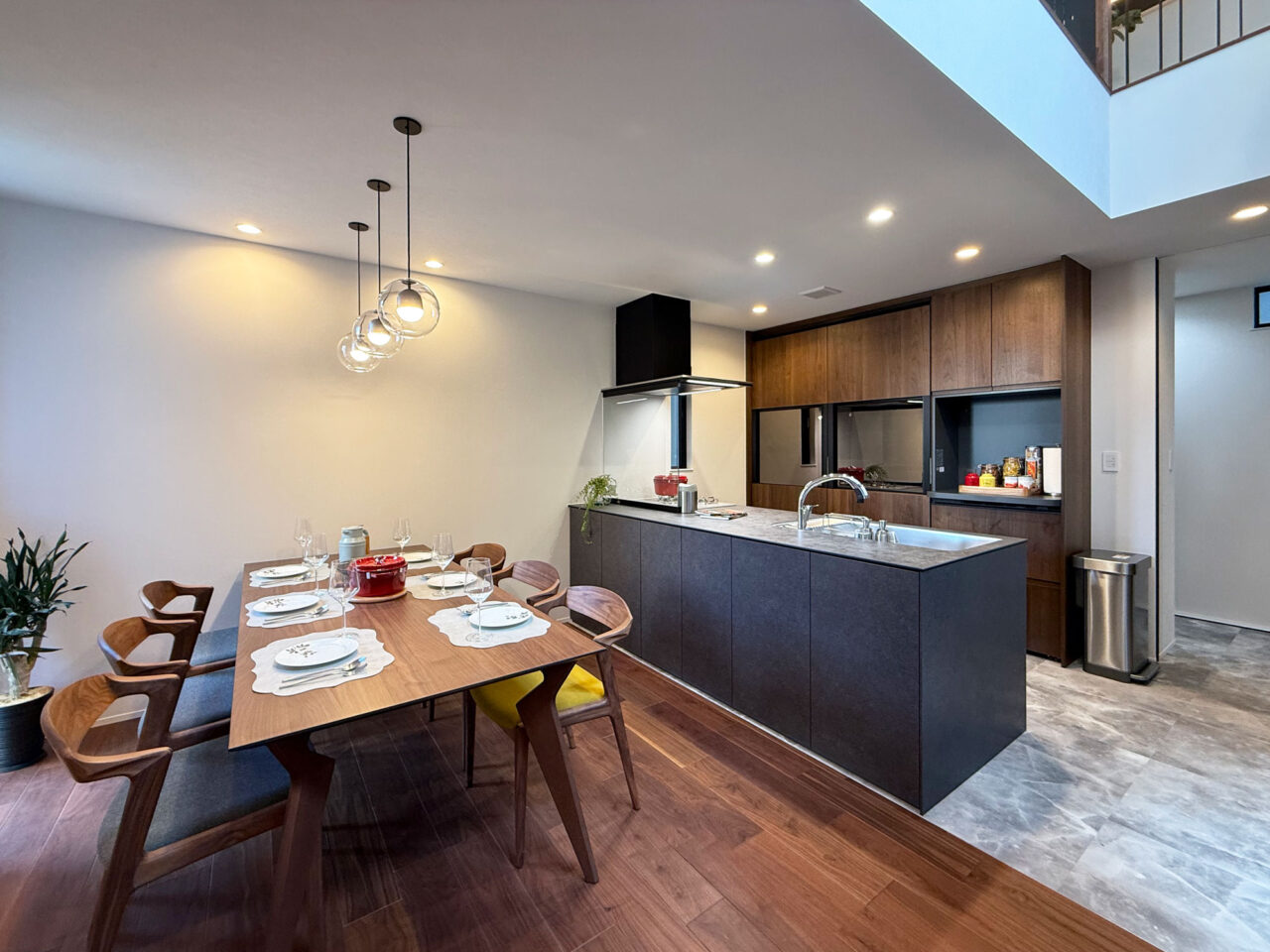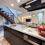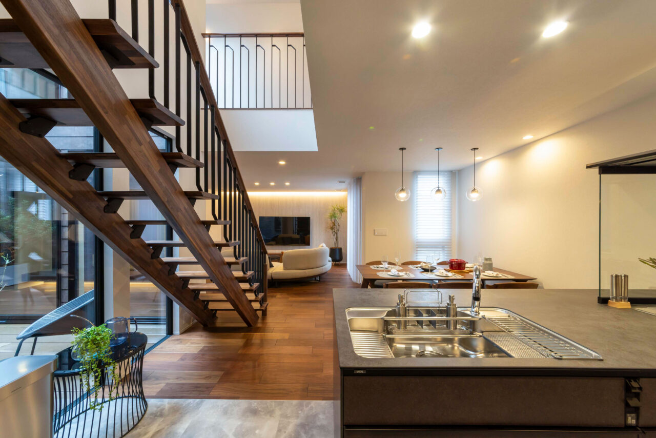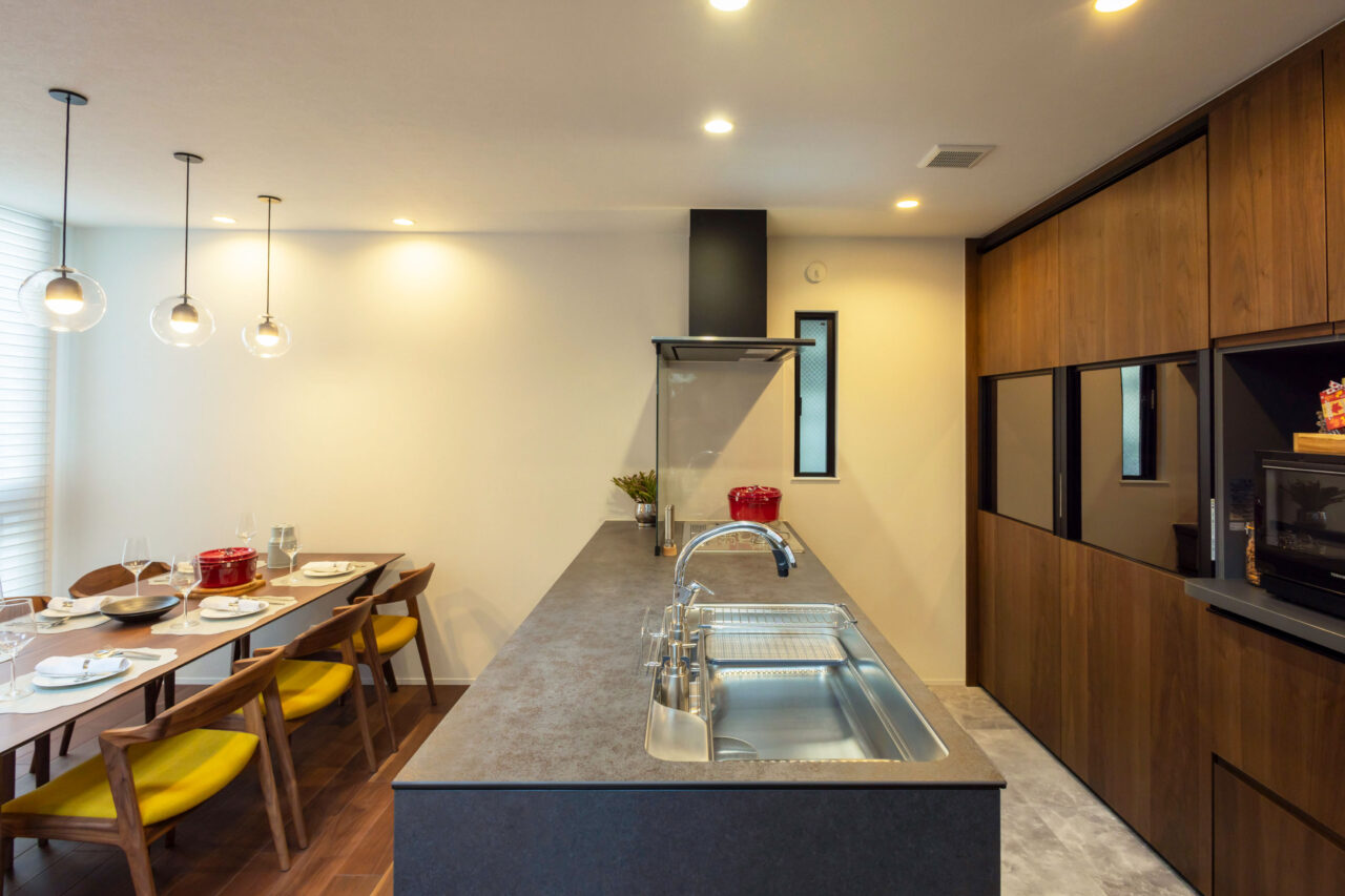 重厚感のあるウォルナットフロアに合わせた同系色のカップボードを採用し、キッチン全体に統一感のあるデザインを実現。マットグレーの面材と意匠性の高い天板が、上質でラグジュアリーなコントラストを生み出し、選び抜かれた素材と洗練されたデザインが魅力のキッチン。