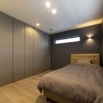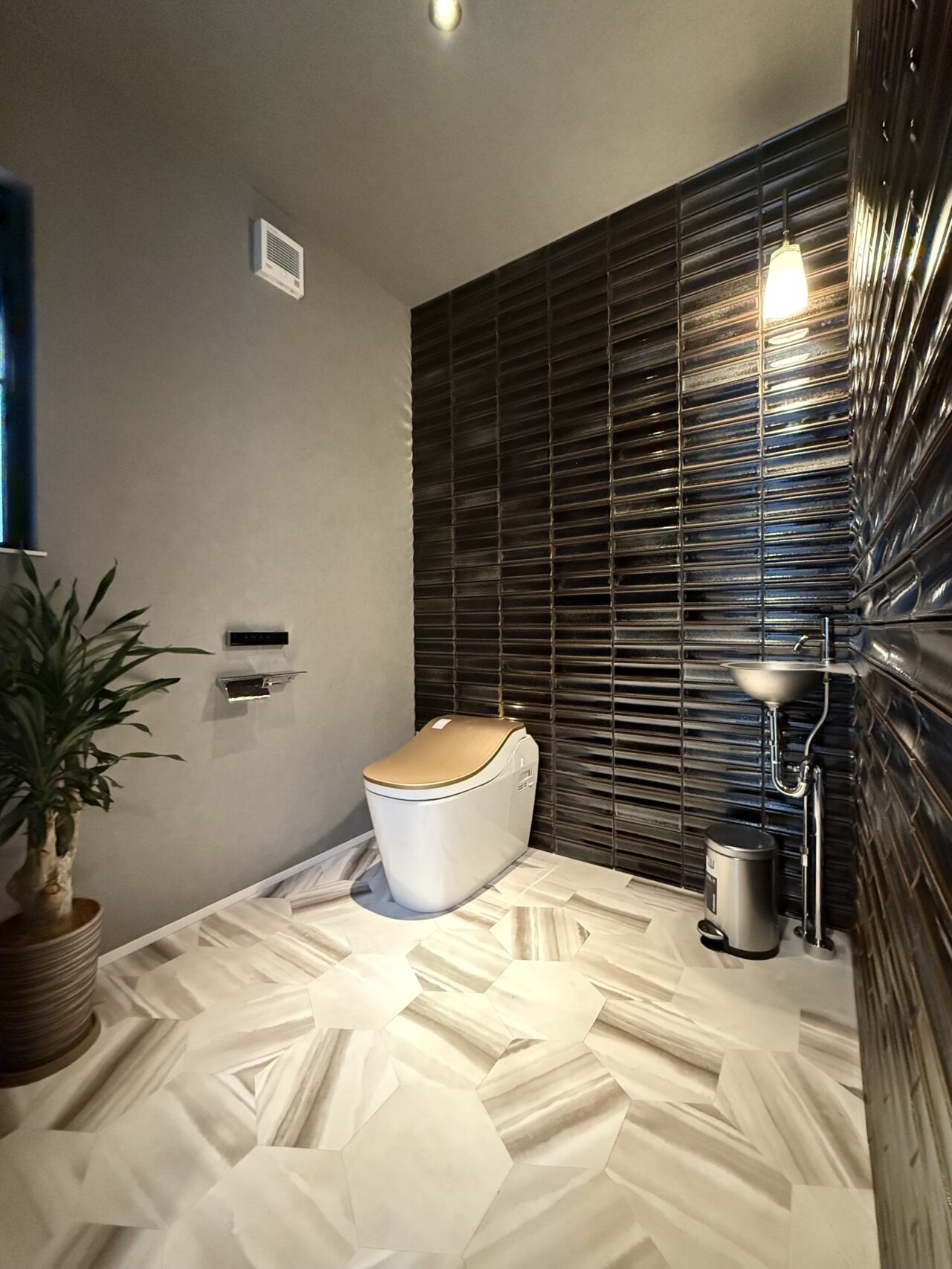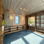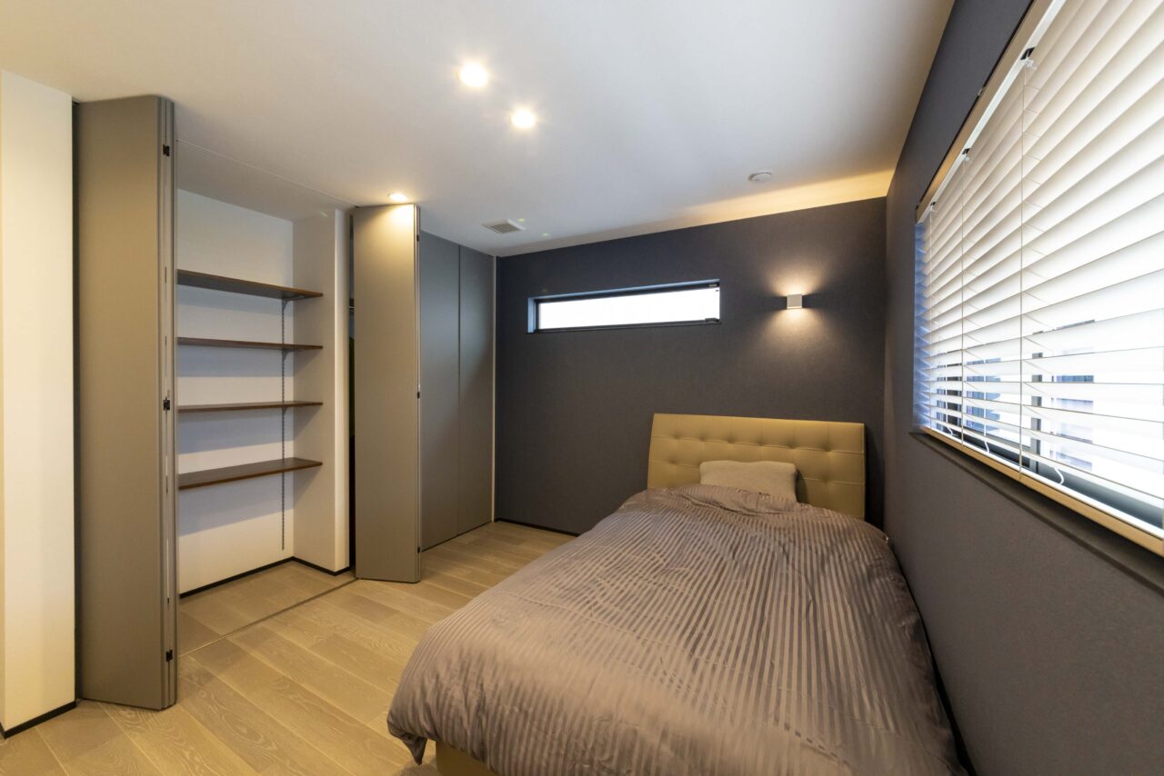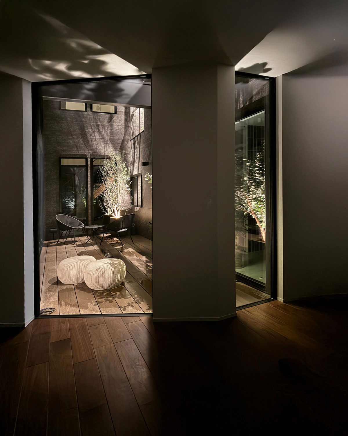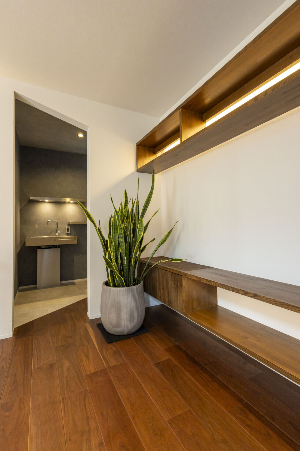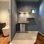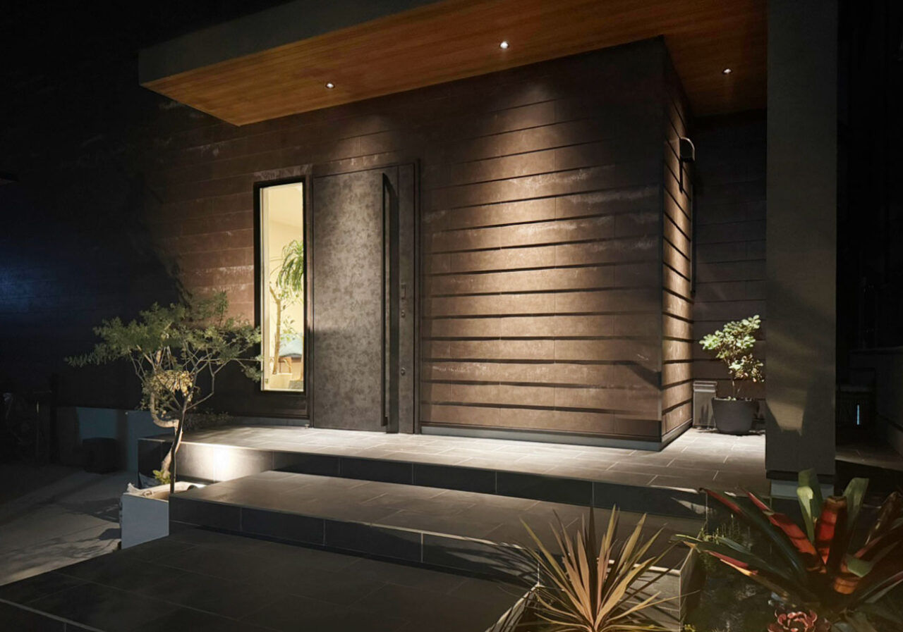 家全体のデザインと調和しつつ、あえて雰囲気を 変え、特別感のあるリゾートライクな設え。 最小限の灯りが陰影や質感を際立たせ、静けさと上質さを兼ね備えた仕上がりに。