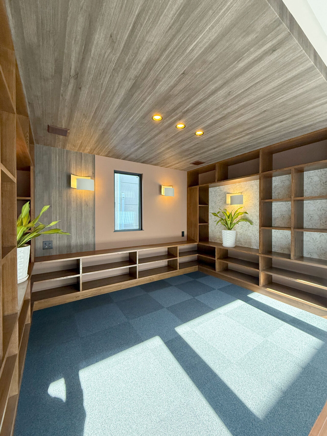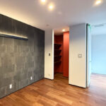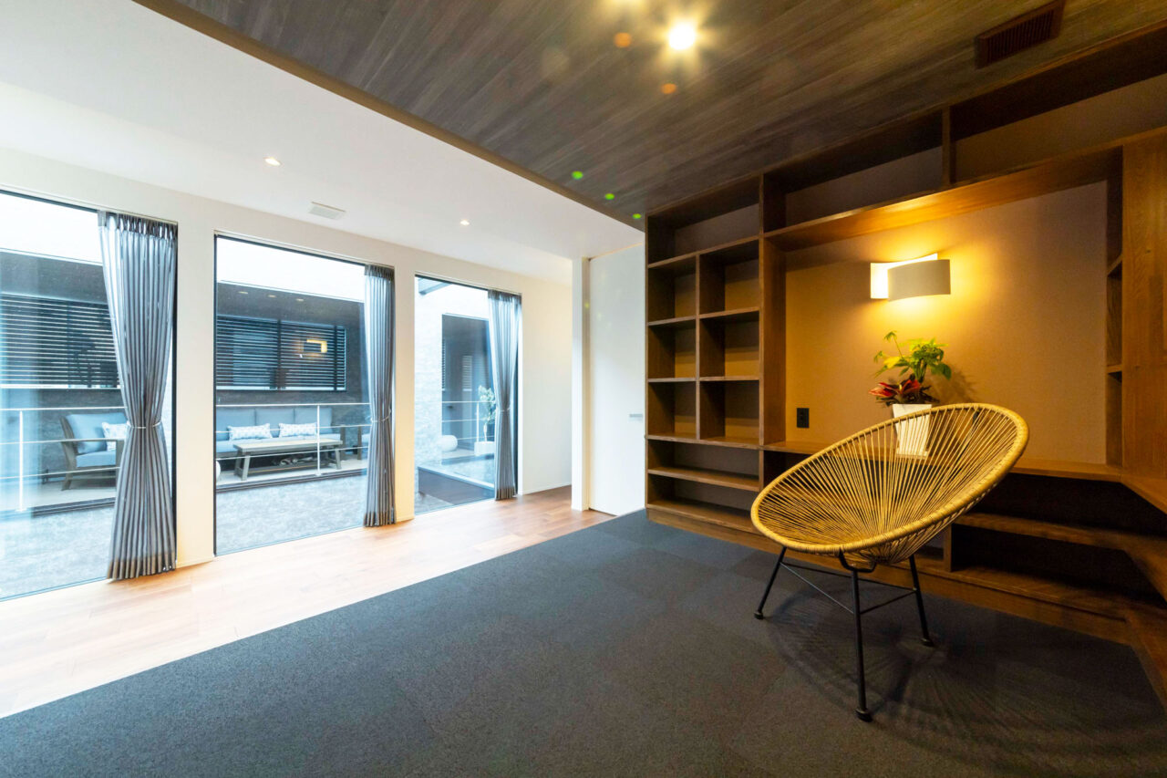 ホテルライクなタイルカーペットと、ウォルナット色の造作棚が織りなす、落ち着きのある趣味スペース。4種類のクロスを巧みに張り分け、単調さを抑えながら、奥行きと素材の表情を引き立てる。 黒のタイルカーペットが空間を引き締め、立体型照明が陰影を際立た せる、個性が光る一角。