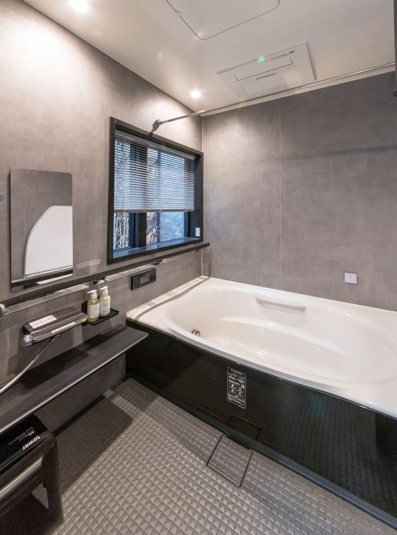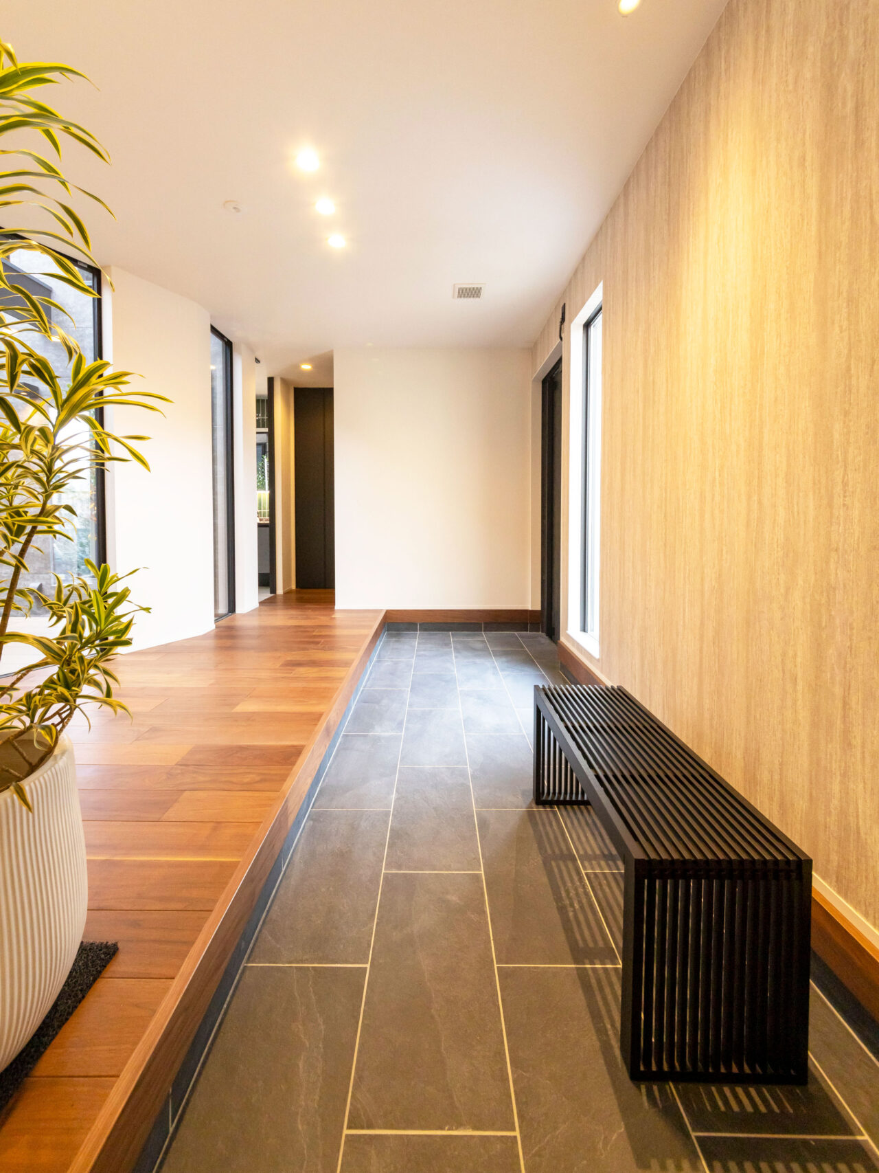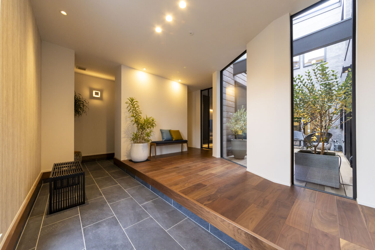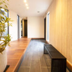 重厚感と上質さを兼ね備えたシックなタイルで、品格漂うエントランスを演出。さらに、長手方向にタイルを配置することで、奥行きと広がりを強調。シンプルながらも、訪れる人を魅了する上質な空間仕上げ。