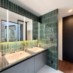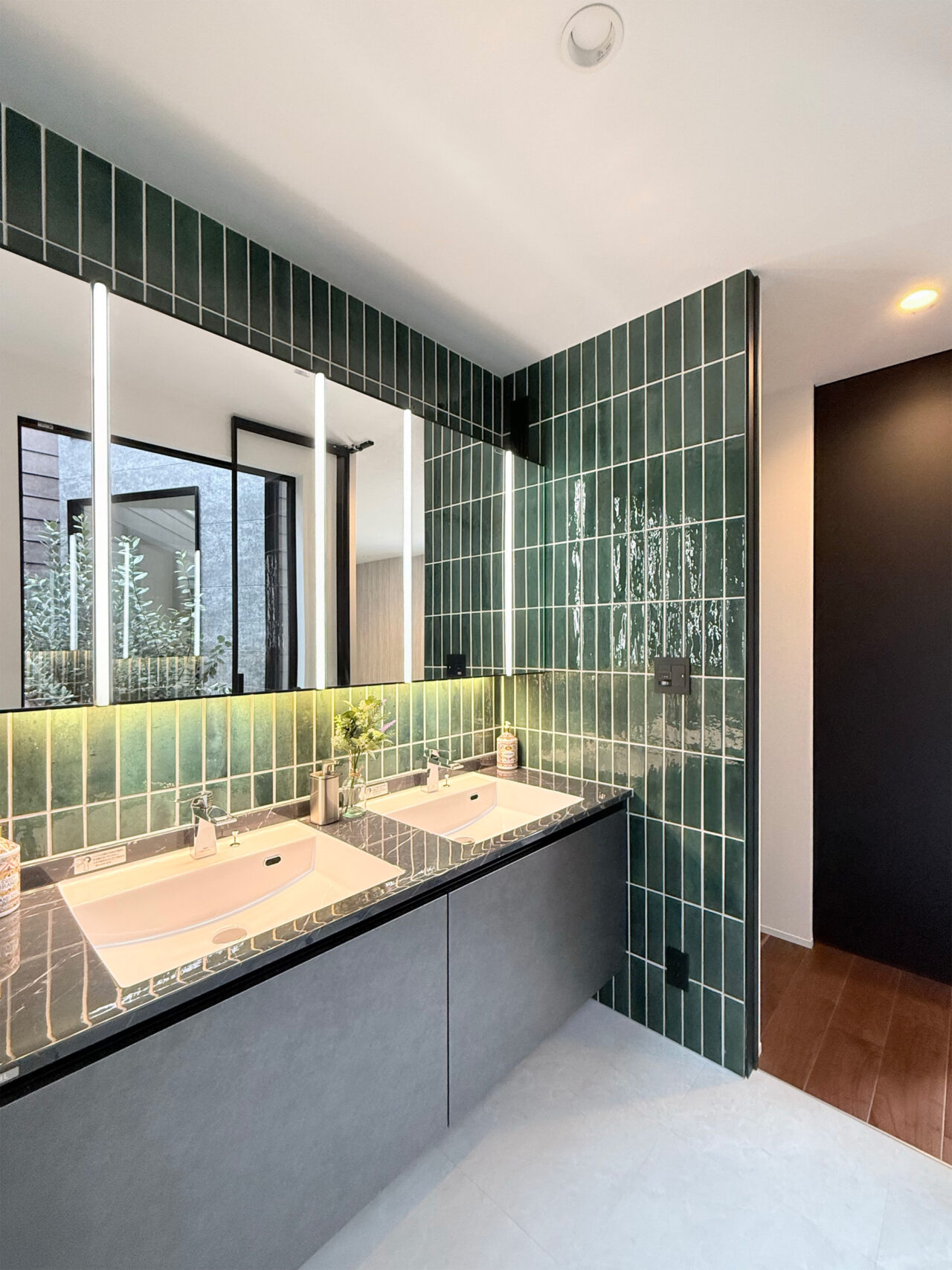 艶のある白い床が空間に清潔感をもたらし、壁には深緑のタイルをセレクト。 光と影のコントラストが美しく、ホテルライクな洗面スペースを実現。 手元を優しく照らす間接照明が、空間に温かみと心地よさをプラス。